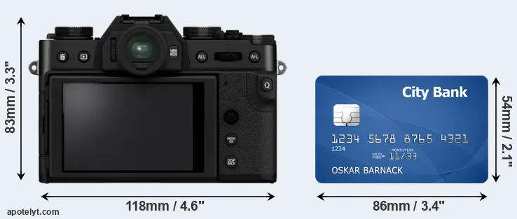 An illustration of the physical dimensions of the Fujifilm X-T30 II vis-à-vis a credit card is provided in the side-by-side display below. Three consecutive views from the front, the top, and the rear side are shown. All size dimensions are rounded to the nearest millimeter.