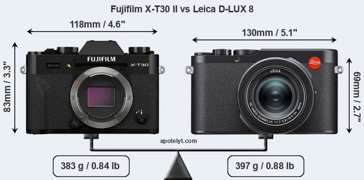 The above size and weight comparisons are to some extent incomplete and possibly misleading, as the D-LUX 8 has a lens built in, whereas the X-T30 II is an interchangeable lens camera that requires a separate lens. Attaching the latter will add extra weight and bulk to the setup. You can compare the optics available for the X-T30 II and their specifications in the Fujinon X Lens Catalog.