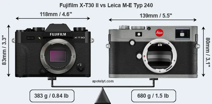 The physical size and weight of the Fujifilm X-T30 II and the Leica M-E Typ 240 are illustrated in the side-by-side display below. The two cameras are presented according to their relative size. Three consecutive perspectives from the front, the top, and the back are available. All width, height and depth measures are rounded to the nearest millimeter.