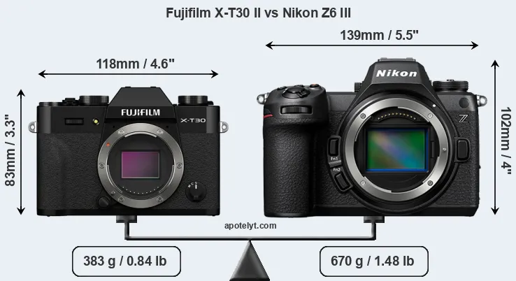 If the front view area (width x height) of the cameras is taken as an aggregate measure of their size, the Nikon Z6 III is considerably larger (45 percent) than the Fujifilm X-T30 II. Moreover, the Z6 III is substantially heavier (75 percent) than the X-T30 II. It is noteworthy in this context that the Z6 III is splash and dust-proof, while the X-T30 II does not feature any corresponding weather-sealing.