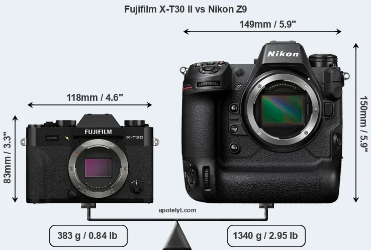 If the front view area (width x height) of the cameras is taken as an aggregate measure of their size, the Nikon Z9 is considerably larger (128 percent) than the Fujifilm X-T30 II. Moreover, the Z9 is substantially heavier (250 percent) than the X-T30 II. It is noteworthy in this context that the Z9 is splash and dust-proof, while the X-T30 II does not feature any corresponding weather-sealing.