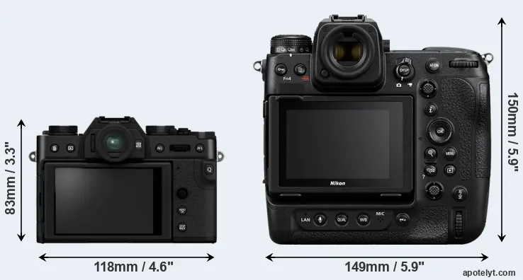The side-by-side display below illustrates the physical size and weight of the Fujifilm X-T30 II and the Nikon Z9. The two cameras are presented according to their relative size. Three successive views from the front, the top, and the rear are shown. All width, height and depth dimensions are rounded to the nearest millimeter.