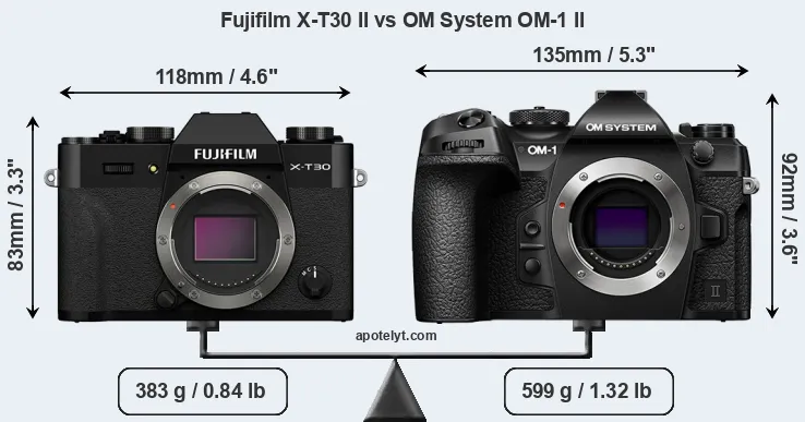 If the front view area (width x height) of the cameras is taken as an aggregate measure of their size, the OM System OM-1 II is notably larger (27 percent) than the Fujifilm X-T30 II. Moreover, the OM-1 II is substantially heavier (56 percent) than the X-T30 II. It is noteworthy in this context that the OM-1 II is splash and dust-proof, while the X-T30 II does not feature any corresponding weather-sealing.