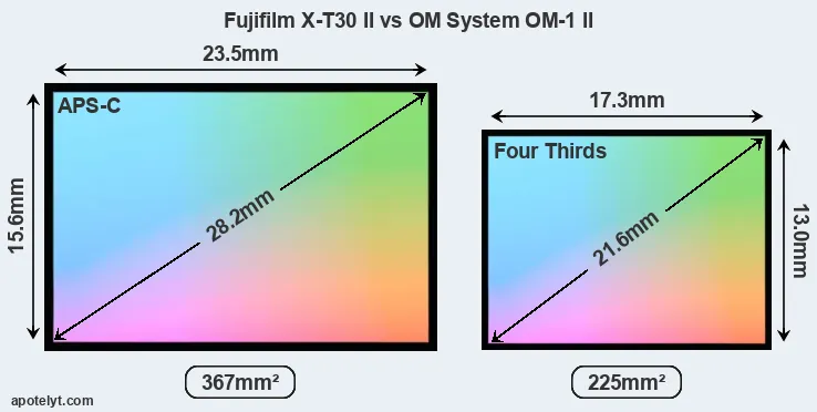 Of the two cameras under consideration, the Fujifilm X-T30 II features an APS-C sensor and the OM System OM-1 II a Four Thirds sensor. The sensor area in the OM-1 II is 39 percent smaller. As a result of these sensor size differences, the cameras have a format factor of, respectively, 1.5 and 2.0. The sensor in the X-T30 II has a native 3:2 aspect ratio, while the one in the OM-1 II offers a 4:3 aspect.