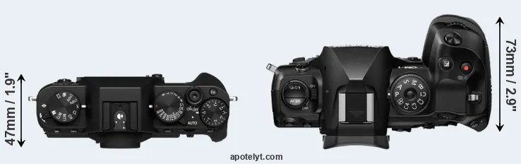 The physical size and weight of the Fujifilm X-T30 II and the OM System OM-1 II are illustrated in the side-by-side display below. The two cameras are presented according to their relative size. Three consecutive perspectives from the front, the top, and the back are available. All width, height and depth dimensions are rounded to the nearest millimeter.