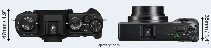 The side-by-side display below illustrates the physical size and weight of the Fujifilm X-T30 II and the Ricoh GR IIIx. The two cameras are presented according to their relative size. Three consecutive views from the front, the top, and the rear side are shown. All width, height and depth dimensions are rounded to the nearest millimeter.