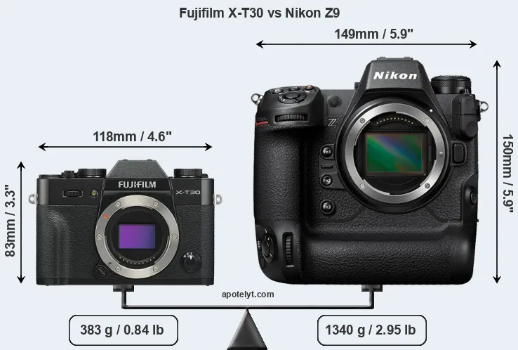 If the front view area (width x height) of the cameras is taken as an aggregate measure of their size, the Nikon Z9 is considerably larger (128 percent) than the Fujifilm X-T30. Moreover, the Z9 is substantially heavier (250 percent) than the X-T30. It is noteworthy in this context that the Z9 is splash and dust-proof, while the X-T30 does not feature any corresponding weather-sealing.