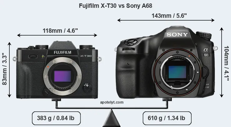 The side-by-side display below illustrates the physical size and weight of the Fujifilm X-T30 and the Sony A68. The two cameras are presented according to their relative size. Three consecutive perspectives from the front, the top, and the back are available. All width, height and depth dimensions are rounded to the nearest millimeter.