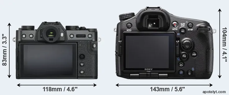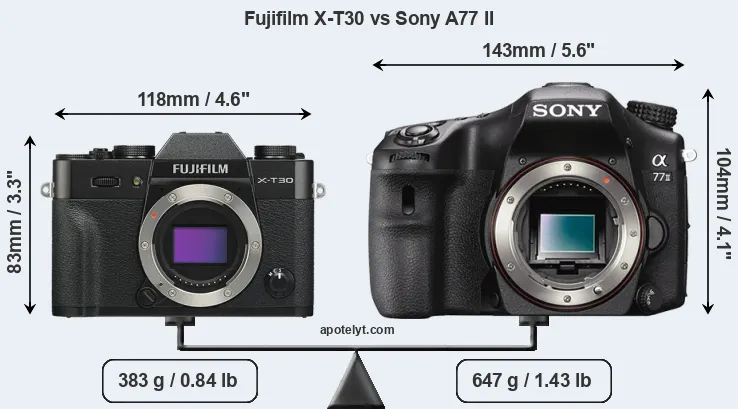 The side-by-side display below illustrates the physical size and weight of the Fujifilm X-T30 and the Sony A77 II. The two cameras are presented according to their relative size. Three consecutive perspectives from the front, the top, and the back are available. All width, height and depth dimensions are rounded to the nearest millimeter.