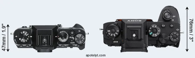 The physical size and weight of the Fujifilm X-T30 and the Sony A9 II are illustrated in the side-by-side display below. The two cameras are presented according to their relative size. Three consecutive perspectives from the front, the top, and the back are available. All width, height and depth measures are rounded to the nearest millimeter.