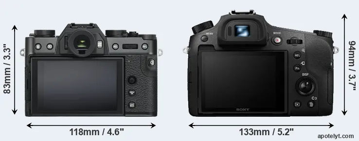 An illustration of the physical size and weight of the Fujifilm X-T30 and the Sony RX10 III is provided in the side-by-side display below. The two cameras are presented according to their relative size. Three successive views from the front, the top, and the rear are shown. All size dimensions are rounded to the nearest millimeter.