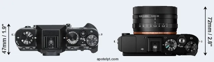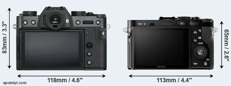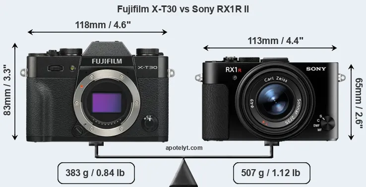 The side-by-side display below illustrates the physical size and weight of the Fujifilm X-T30 and the Sony RX1R II. The two cameras are presented according to their relative size. Three successive views from the front, the top, and the rear are shown. All width, height and depth measures are rounded to the nearest millimeter.