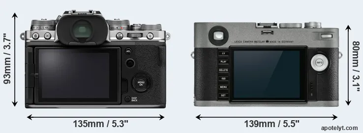 The side-by-side display below illustrates the physical size and weight of the Fujifilm X-T4 and the Leica M-E Typ 240. The two cameras are presented according to their relative size. Three consecutive perspectives from the front, the top, and the back are available. All width, height and depth measures are rounded to the nearest millimeter.