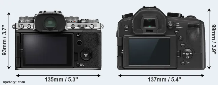 The physical size and weight of the Fujifilm X-T4 and the Leica V-LUX Typ 114 are illustrated in the side-by-side display below. The two cameras are presented according to their relative size. Three consecutive views from the front, the top, and the rear side are shown. All width, height and depth measures are rounded to the nearest millimeter.