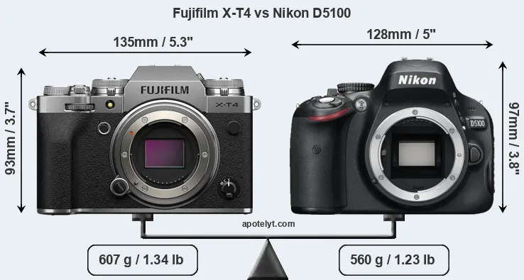 If the front view area (width x height) of the cameras is taken as an aggregate measure of their size, the Nikon D5100 is somewhat smaller (1 percent) than the Fujifilm X-T4. Moreover, the D5100 is markedly lighter (8 percent) than the X-T4. It is worth mentioning in this context that the X-T4 is splash and dust resistant, while the D5100 does not feature any corresponding weather-sealing.