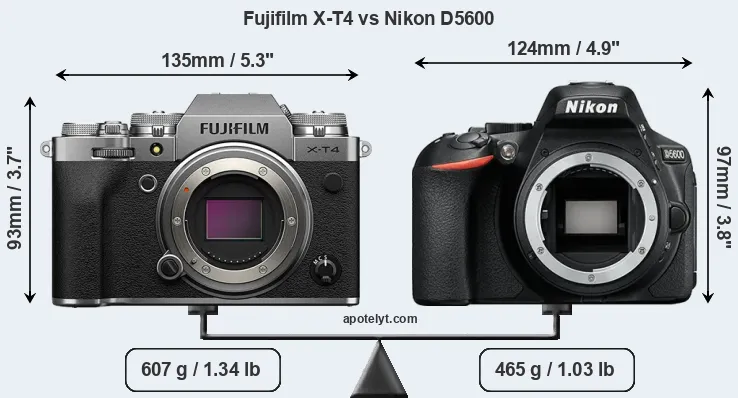 If the front view area (width x height) of the cameras is taken as an aggregate measure of their size, the Nikon D5600 is somewhat smaller (4 percent) than the Fujifilm X-T4. Moreover, the D5600 is markedly lighter (23 percent) than the X-T4. It is worth mentioning in this context that the X-T4 is splash and dust resistant, while the D5600 does not feature any corresponding weather-sealing.