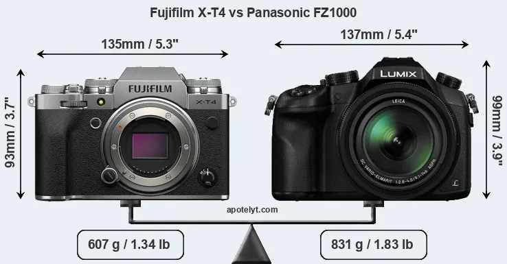The physical size and weight of the Fujifilm X-T4 and the Panasonic FZ1000 are illustrated in the side-by-side display below. The two cameras are presented according to their relative size. Three consecutive views from the front, the top, and the rear side are shown. All width, height and depth measures are rounded to the nearest millimeter.