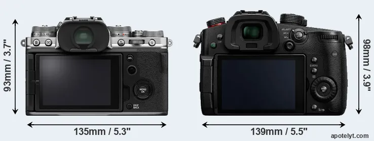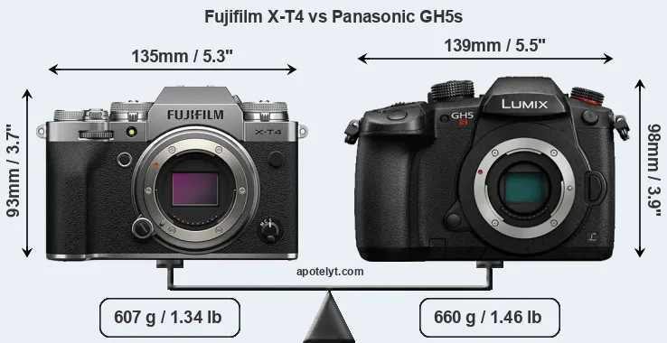 The side-by-side display below illustrates the physical size and weight of the Fujifilm X-T4 and the Panasonic GH5s. The two cameras are presented according to their relative size. Three consecutive perspectives from the front, the top, and the back are available. All size dimensions are rounded to the nearest millimeter.