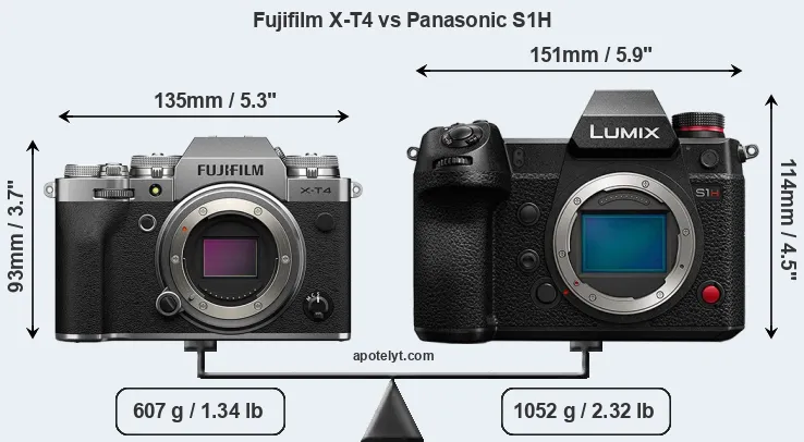An illustration of the physical size and weight of the Fujifilm X-T4 and the Panasonic S1H is provided in the side-by-side display below. The two cameras are presented according to their relative size. Three consecutive views from the front, the top, and the rear side are shown. All width, height and depth measures are rounded to the nearest millimeter.