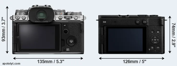 The physical size and weight of the Fujifilm X-T4 and the Panasonic S9 are illustrated in the side-by-side display below. The two cameras are presented according to their relative size. Three consecutive views from the front, the top, and the rear side are shown. All width, height and depth dimensions are rounded to the nearest millimeter.
