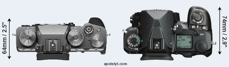 The side-by-side display below illustrates the physical size and weight of the Fujifilm X-T4 and the Pentax K-3 III. The two cameras are presented according to their relative size. Three successive views from the front, the top, and the rear are shown. All width, height and depth dimensions are rounded to the nearest millimeter.