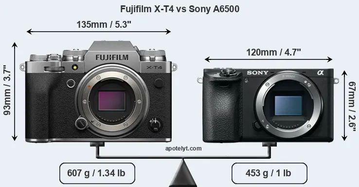 The physical size and weight of the Fujifilm X-T4 and the Sony A6500 are illustrated in the side-by-side display below. The two cameras are presented according to their relative size. Three consecutive perspectives from the front, the top, and the back are available. All width, height and depth measures are rounded to the nearest millimeter.