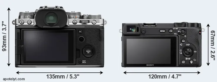 The physical size and weight of the Fujifilm X-T4 and the Sony A6600 are illustrated in the side-by-side display below. The two cameras are presented according to their relative size. Three consecutive perspectives from the front, the top, and the back are available. All width, height and depth measures are rounded to the nearest millimeter.