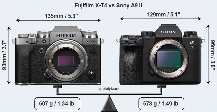 The side-by-side display below illustrates the physical size and weight of the Fujifilm X-T4 and the Sony A9 II. The two cameras are presented according to their relative size. Three consecutive views from the front, the top, and the rear side are shown. All width, height and depth measures are rounded to the nearest millimeter.