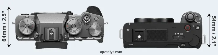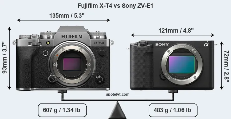 The side-by-side display below illustrates the physical size and weight of the Fujifilm X-T4 and the Sony ZV-E1. The two cameras are presented according to their relative size. Three consecutive views from the front, the top, and the rear side are shown. All width, height and depth measures are rounded to the nearest millimeter.