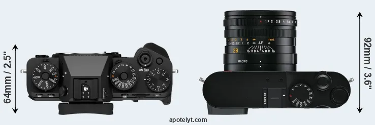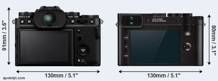 If the front view area (width x height) of the cameras is taken as an aggregate measure of their size, the Leica Q2 is notably smaller (12 percent) than the Fujifilm X-T5. In this context, it is worth noting that both cameras are splash and dust-proof and can, hence, be used in inclement weather conditions or harsh environments.