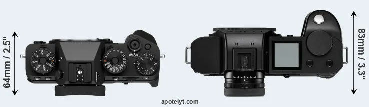 The side-by-side display below illustrates the physical size and weight of the Fujifilm X-T5 and the Leica SL2-S. The two cameras are presented according to their relative size. Three consecutive views from the front, the top, and the rear side are shown. All width, height and depth measures are rounded to the nearest millimeter.