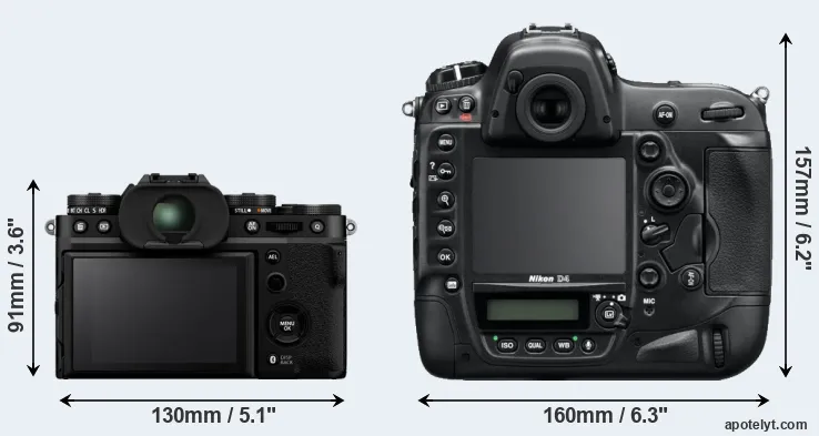 The physical size and weight of the Fujifilm X-T5 and the Nikon D4 are illustrated in the side-by-side display below. The two cameras are presented according to their relative size. Three consecutive views from the front, the top, and the rear side are shown. All width, height and depth measures are rounded to the nearest millimeter.