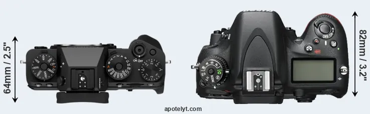 The side-by-side display below illustrates the physical size and weight of the Fujifilm X-T5 and the Nikon D600. The two cameras are presented according to their relative size. Three consecutive views from the front, the top, and the rear side are shown. All width, height and depth dimensions are rounded to the nearest millimeter.