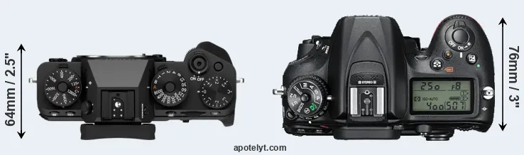 The side-by-side display below illustrates the physical size and weight of the Fujifilm X-T5 and the Nikon D7200. The two cameras are presented according to their relative size. Three consecutive views from the front, the top, and the rear side are shown. All width, height and depth measures are rounded to the nearest millimeter.