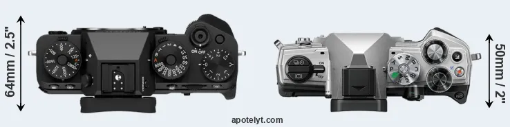 The side-by-side display below illustrates the physical size and weight of the Fujifilm X-T5 and the OM System OM-5. The two cameras are presented according to their relative size. Three successive views from the front, the top, and the rear are shown. All width, height and depth measures are rounded to the nearest millimeter.