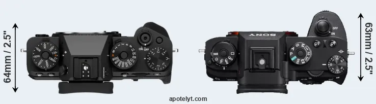 The physical size and weight of the Fujifilm X-T5 and the Sony A9 are illustrated in the side-by-side display below. The two cameras are presented according to their relative size. Three consecutive views from the front, the top, and the rear side are shown. All size dimensions are rounded to the nearest millimeter.