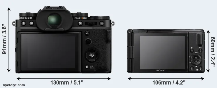 The side-by-side display below illustrates the physical size and weight of the Fujifilm X-T5 and the Sony ZV-1 II. The two cameras are presented according to their relative size. Three consecutive views from the front, the top, and the rear side are shown. All width, height and depth dimensions are rounded to the nearest millimeter.