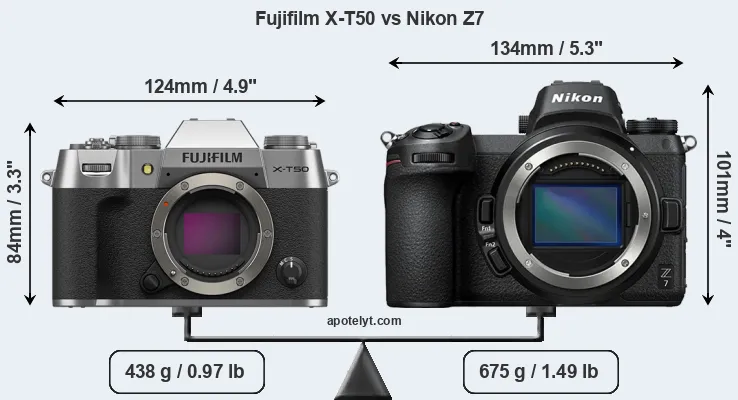 The physical size and weight of the Fujifilm X-T50 and the Nikon Z7 are illustrated in the side-by-side display below. The two cameras are presented according to their relative size. Three consecutive views from the front, the top, and the rear side are shown. All width, height and depth dimensions are rounded to the nearest millimeter.