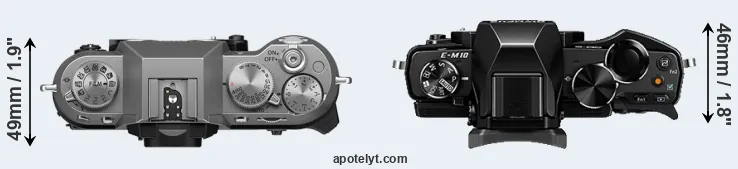 The side-by-side display below illustrates the physical size and weight of the Fujifilm X-T50 and the Olympus E-M10. The two cameras are presented according to their relative size. Three consecutive perspectives from the front, the top, and the back are available. All width, height and depth measures are rounded to the nearest millimeter.