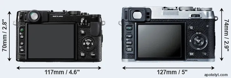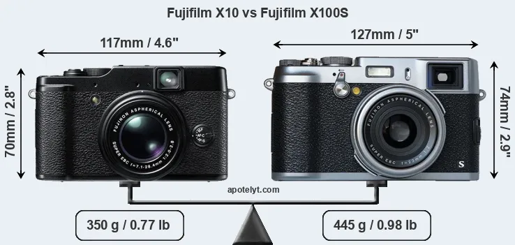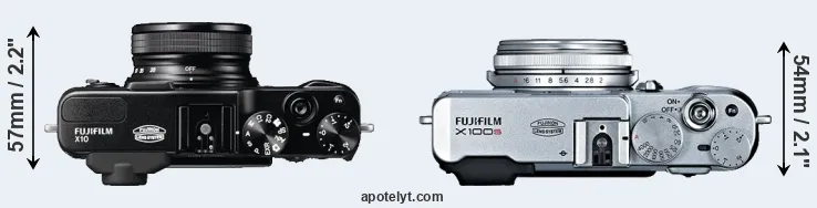 An illustration of the physical size and weight of the Fujifilm X10 and the Fujifilm X100S is provided in the side-by-side display below. The two cameras are presented according to their relative size. Three consecutive views from the front, the top, and the rear side are shown. All width, height and depth dimensions are rounded to the nearest millimeter.