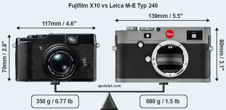 If the front view area (width x height) of the cameras is taken as an aggregate measure of their size, the Leica M-E Typ 240 is notably larger (36 percent) than the Fujifilm X10. It is noteworthy in this context that the M-E Typ 240 is splash and dust-proof, while the X10 does not feature any corresponding weather-sealing.