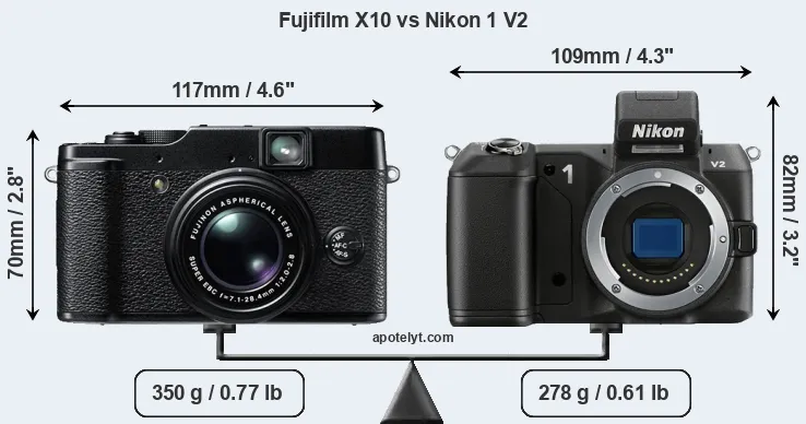 An illustration of the physical size and weight of the Fujifilm X10 and the Nikon 1 V2 is provided in the side-by-side display below. The two cameras are presented according to their relative size. Three successive views from the front, the top, and the rear are shown. All size dimensions are rounded to the nearest millimeter.