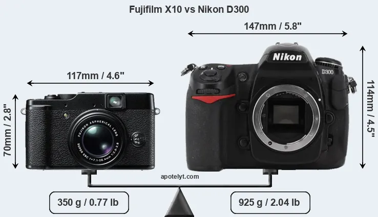 The physical size and weight of the Fujifilm X10 and the Nikon D300 are illustrated in the side-by-side display below. The two cameras are presented according to their relative size. Three successive views from the front, the top, and the rear are shown. All width, height and depth measures are rounded to the nearest millimeter.