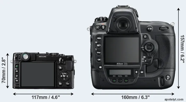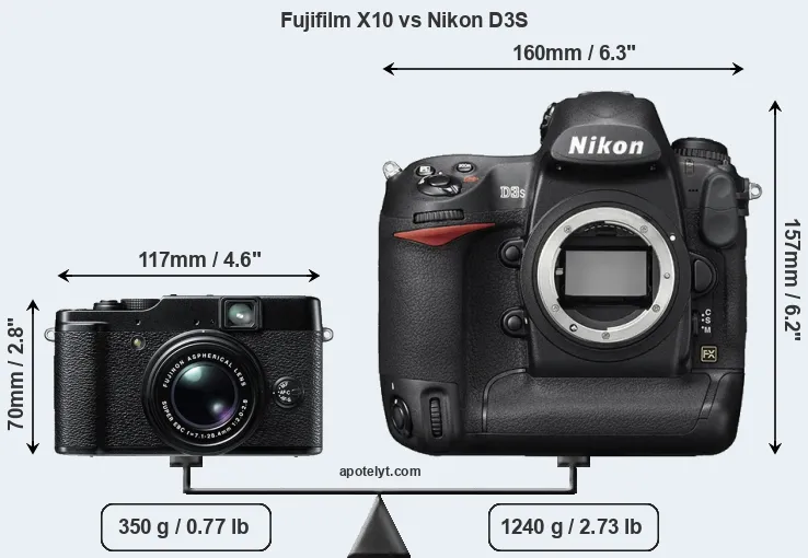 If the front view area (width x height) of the cameras is taken as an aggregate measure of their size, the Nikon D3S is considerably larger (207 percent) than the Fujifilm X10. It is noteworthy in this context that the D3S is splash and dust-proof, while the X10 does not feature any corresponding weather-sealing.