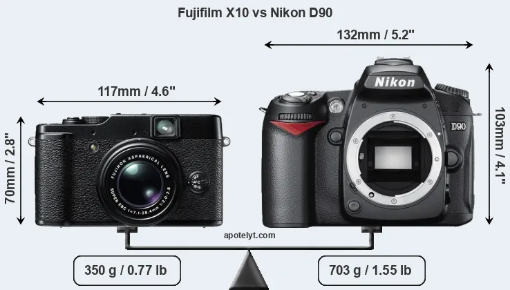 The physical size and weight of the Fujifilm X10 and the Nikon D90 are illustrated in the side-by-side display below. The two cameras are presented according to their relative size. Three successive views from the front, the top, and the rear are shown. All width, height and depth measures are rounded to the nearest millimeter.