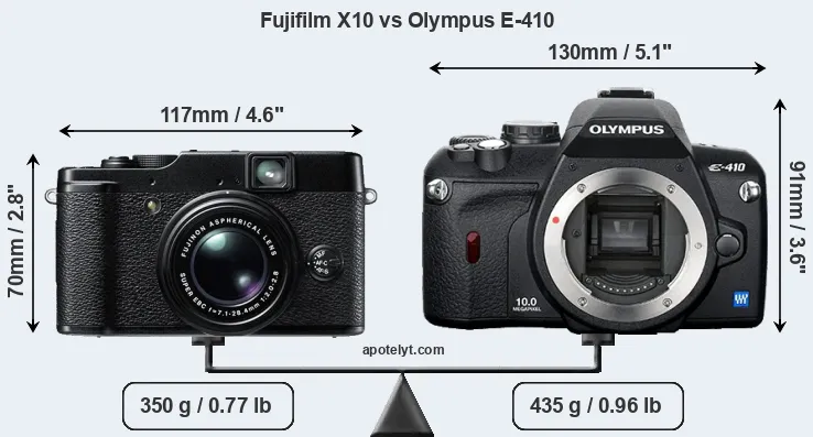 An illustration of the physical size and weight of the Fujifilm X10 and the Olympus E-410 is provided in the side-by-side display below. The two cameras are presented according to their relative size. Three consecutive perspectives from the front, the top, and the back are available. All width, height and depth measures are rounded to the nearest millimeter.