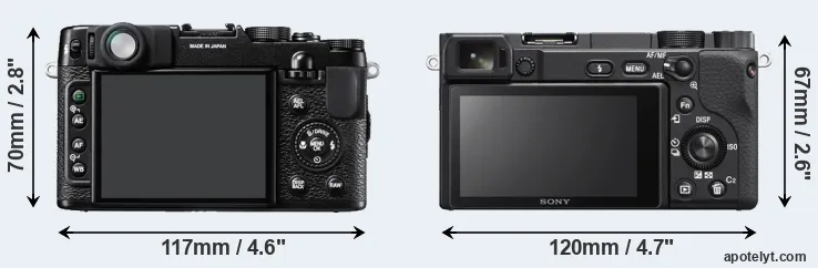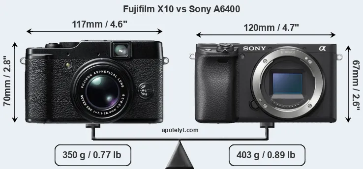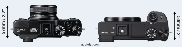 The side-by-side display below illustrates the physical size and weight of the Fujifilm X10 and the Sony A6400. The two cameras are presented according to their relative size. Three consecutive perspectives from the front, the top, and the back are available. All width, height and depth measures are rounded to the nearest millimeter.