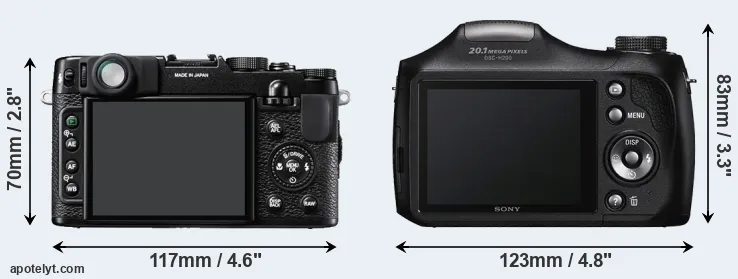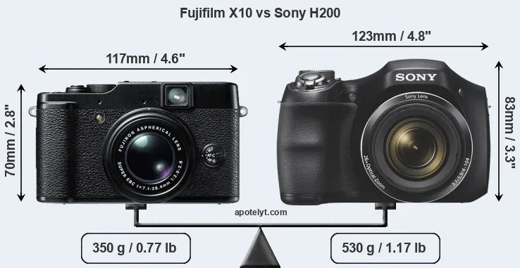 The side-by-side display below illustrates the physical size and weight of the Fujifilm X10 and the Sony H200. The two cameras are presented according to their relative size. Three consecutive views from the front, the top, and the rear side are shown. All width, height and depth dimensions are rounded to the nearest millimeter.