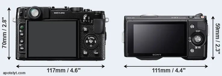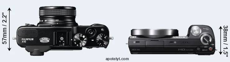 The side-by-side display below illustrates the physical size and weight of the Fujifilm X10 and the Sony NEX-5N. The two cameras are presented according to their relative size. Three successive views from the front, the top, and the rear are shown. All width, height and depth dimensions are rounded to the nearest millimeter.