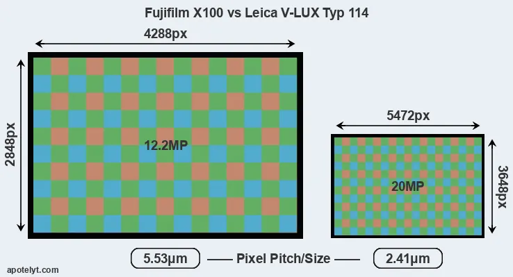 Despite having a smaller sensor, the V-LUX Typ 114 offers a higher resolution of 20 megapixels, compared with 12.2 MP of the X100. This megapixels advantage comes at the cost of a higher pixel density and a smaller size of the individual pixel (with a pixel pitch of 2.41μm versus 5.53μm for the X100). However, it should be noted that the V-LUX Typ 114 is much more recent (by 3 years and 11 months) than the X100, and its sensor will have benefitted from technological advances during this time that make it possible to gather light more efficiently.